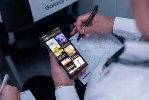 - Introduksjon av Galaxy S24 i en romlig installasjon utformet som en flykabin